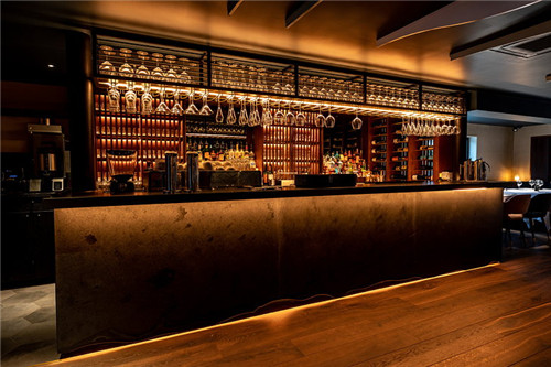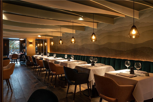 这家多功能酒吧,除了酒吧还有餐厅一体的,在传统的船板包层中,立面被错综复杂的金色表现层所软化,这些表现层被设计来反射自然光,同时创造出错综复杂的内部阴影。